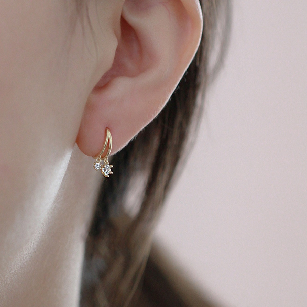 フープの下部には、2粒のクリアなジルコニアが揺れ、光を受けて上品にキラキラと輝きます。