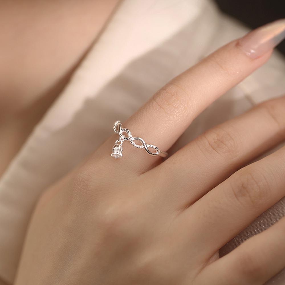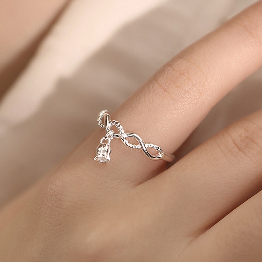 繊細なラインが交差する「ツイスト(絡み合い)」デザインに、きらめくドロップチャームを添えた、華奢でロマンチックなリングです。