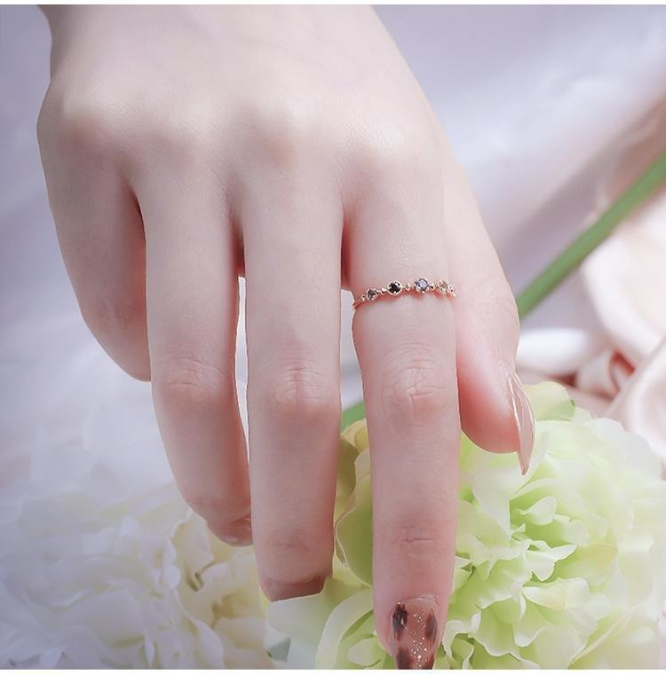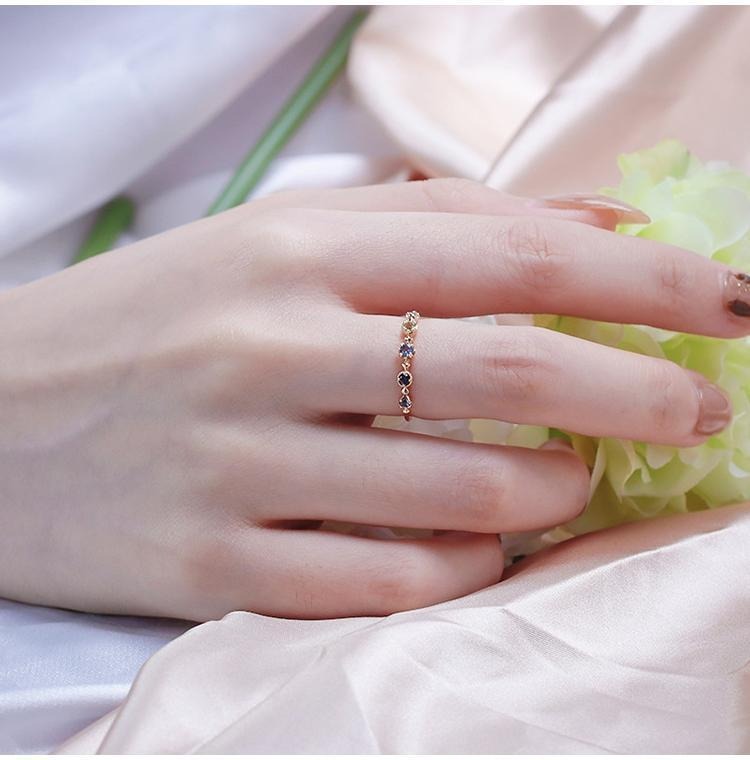 小さなラウンドカットのジルコニアが連なる、お守りのように身に着けたい繊細なリングです。