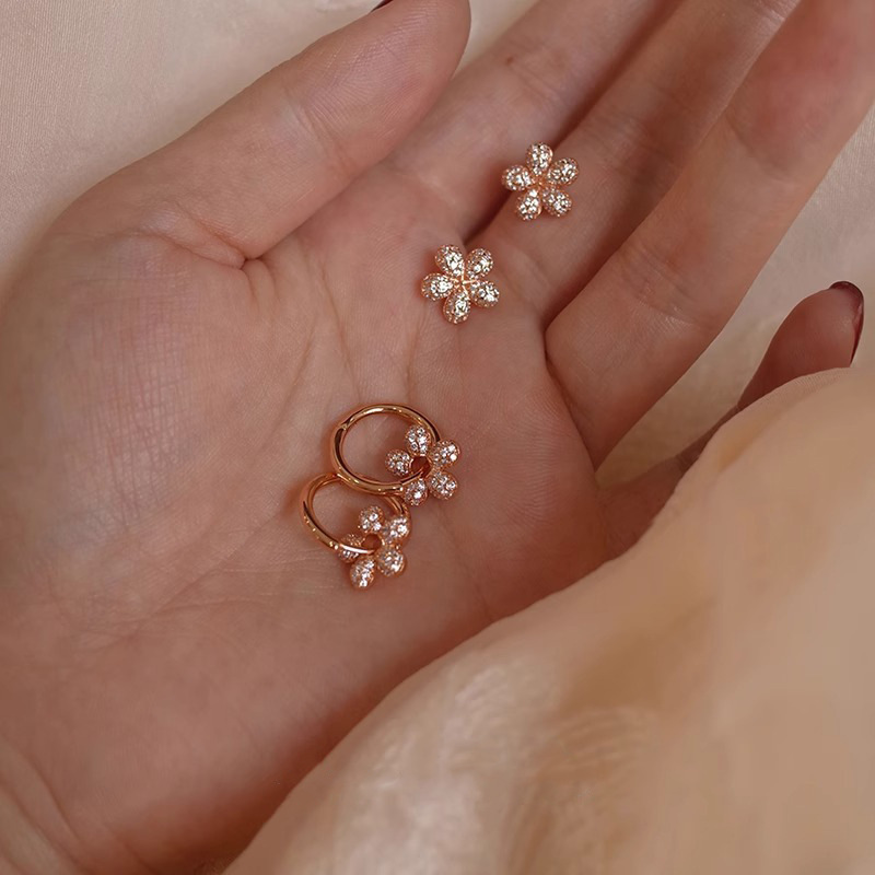 フラワーモチーフ: 小さなクリアストーン(ラインストーンまたはジルコニア)が5粒集まって、愛らしい花びらを表現しています。中央のストーンが一回り大きく、立体感と輝きをプラスしています。