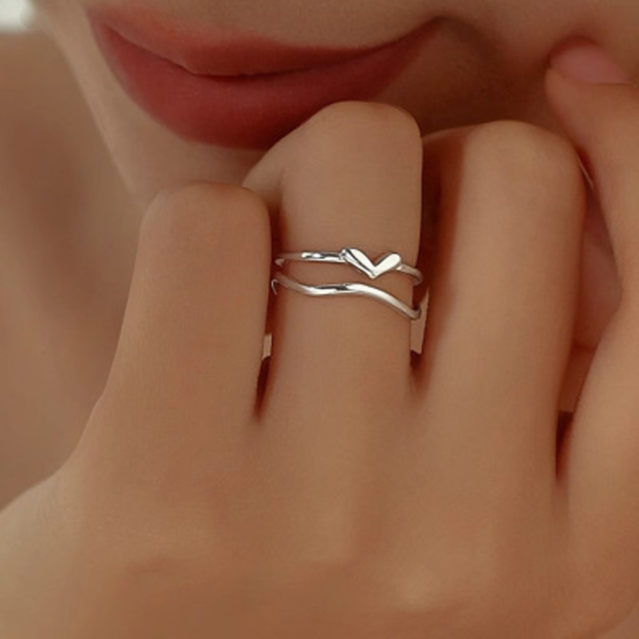 流れるようなウェーブライン: 2本の異なる太さのラインが交差し、指を包み込むような立体的で美しいウェーブを描いています。